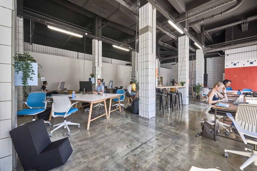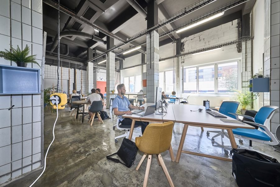 Der industrielle Charakter wird mit minimalen Eingriffen erhalten. Das Ergebnis sind hohe, offene Räume mit sichtbaren technischen Installationen. Frei gestellte Arbeitsplätze mit herabhängenden Elektroanschlüssen unterstützen den gewünschten Charakter kreativer und innovativer Arbeitswelten.