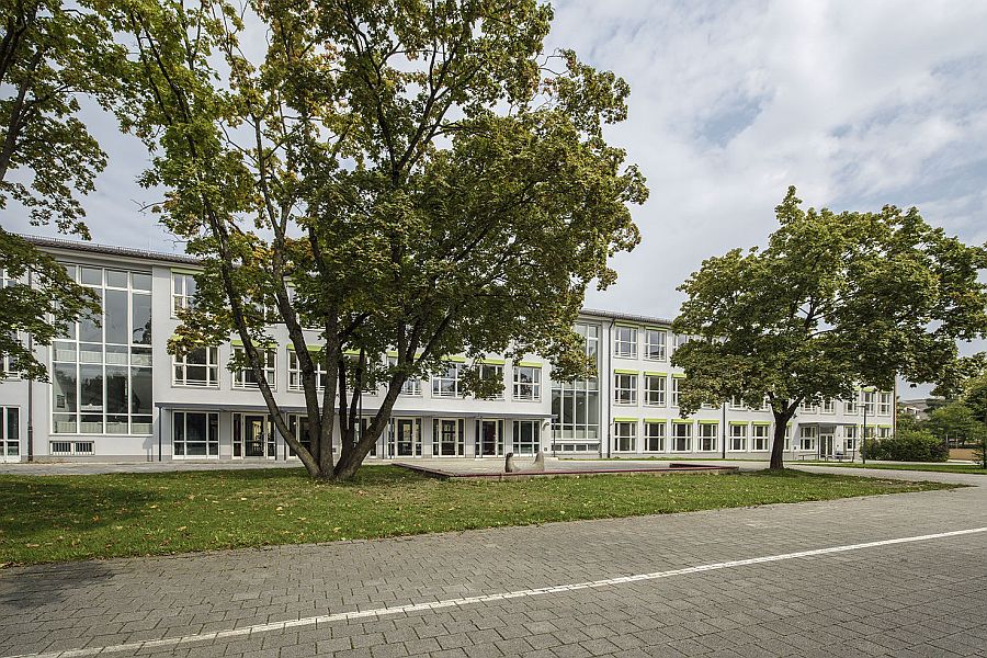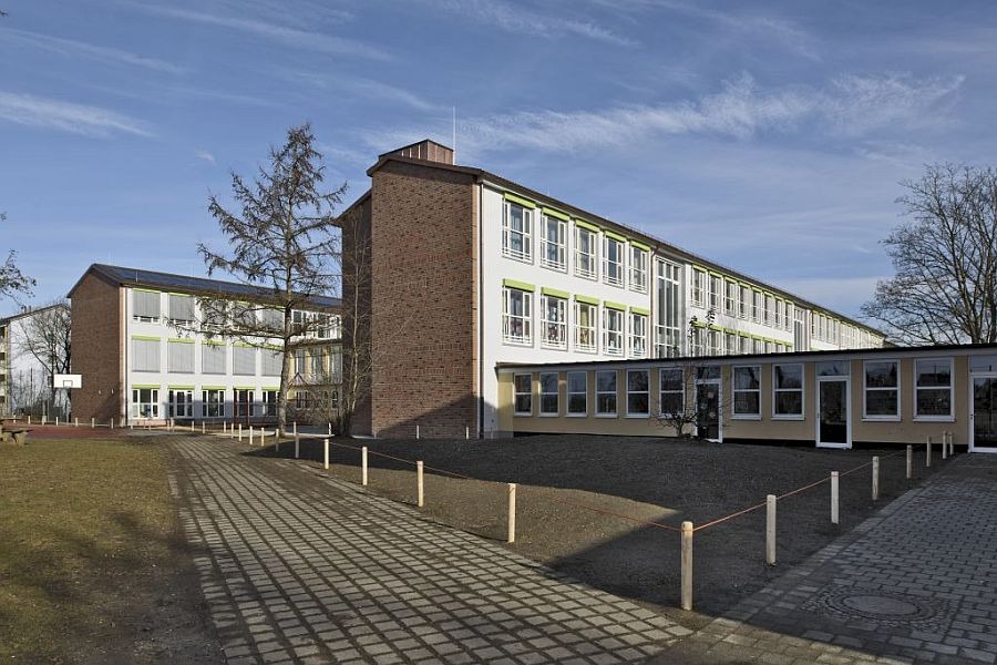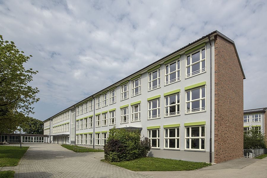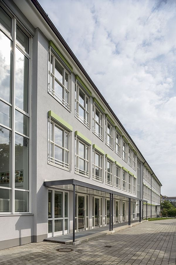 Die Gebäudehülle wird energetisch saniert. Hierzu wird ein Wärmedämmverbundsystem aus Mineralwolle und Dickputzsystem aufgebracht und alte Holzfenster gegen Holz-Alu-Fenster ausgetauscht. Noch nicht gedämmten Geschossdecken begegnen wir mit einer Einblasdämmung auf Zellulosebasis. Energetisch noch tragfähige Bauteile wie zwischenzeitlich eingebaute Aluminiumfenster, bereits sanierte Gebäudeteile oder die Pfosten-Riegel-Fassaden der Treppenräume bleiben von der Maßnahme unberührt. Ein neues Farb- und Materialkonzept fasst den Gebäudekomplex gestalterisch zusammen: Rotbraun geklinkerte Giebelwände und rostrote Aussenwände sowie graue Fenster- und Türrahmen treten in einen interessanten Kontrast zu der in frischem Grün gehaltenenen Sonnenschutzanlage. Somit erhält die Schule ein neues, freundliches Gesicht.