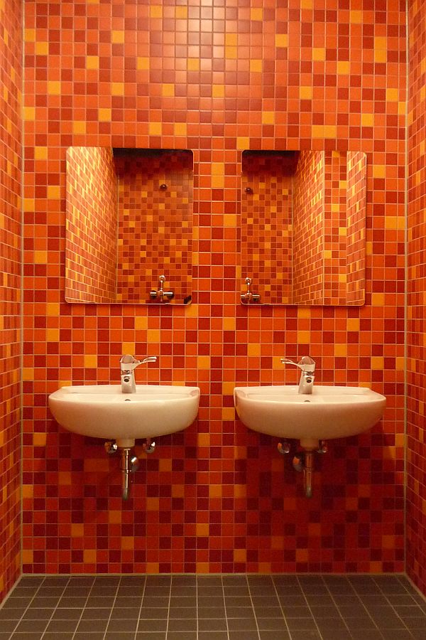 Veranstaltungen und Theateraufführungen in der Halle. Ein Farbkonzept in kräftigen Gelb-, Orange- und Rottönen findet sich im Fliesenmosaik der Saniätärräume oder in der Gestaltung des Eingangsbereichs wider.