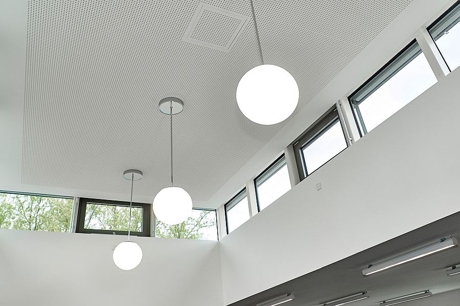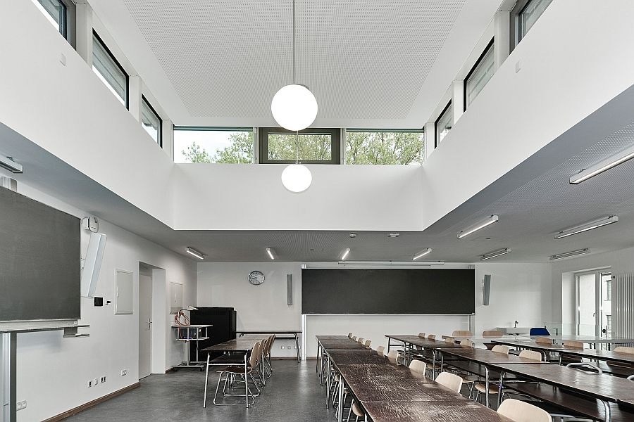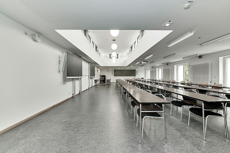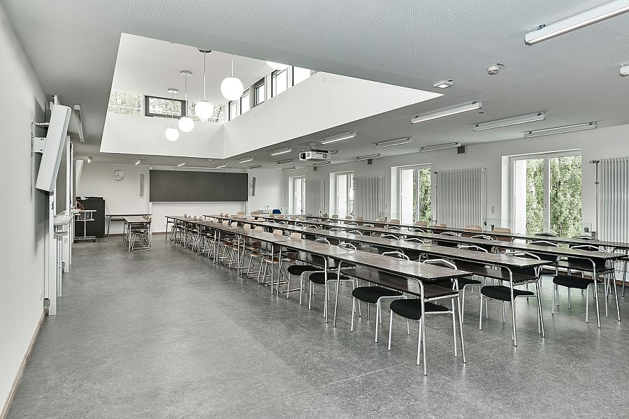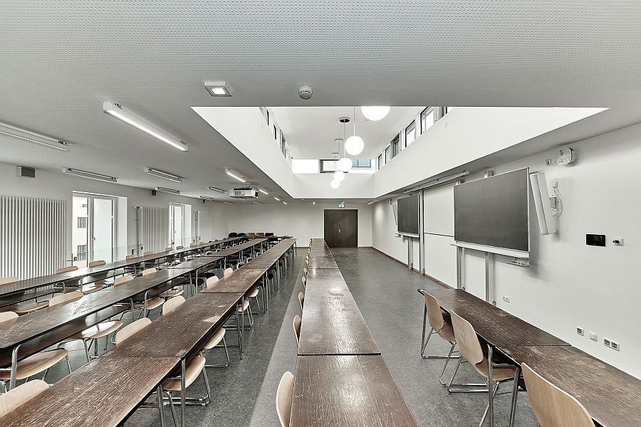 Der Hörsaal im 2. OG wird umfassend saniert, dabei neu gestaltet und mit neuesten Medien-, Akustik- und Lichttechniken versehen. Die aufsitzende „Laterne“ wird in Pfosten-Riegel-Technik gebaut.